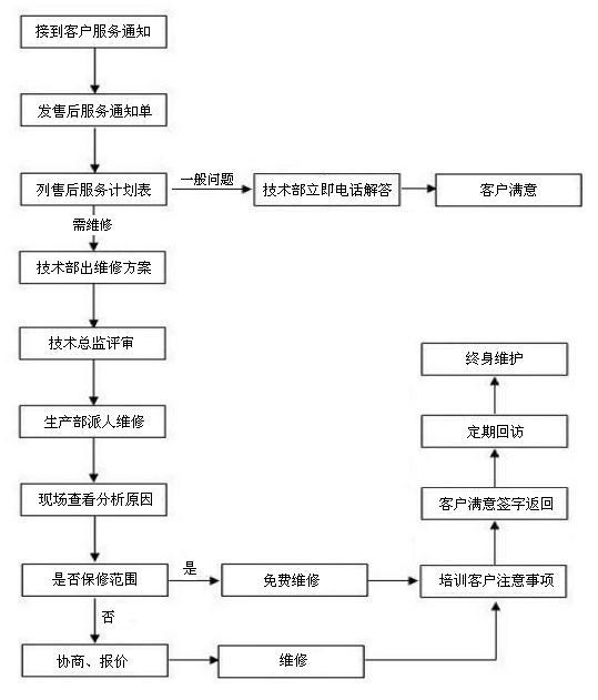 售后服務(wù)是我公司重點工作之一,我公司鄭重對客戶做出如下承諾:(1) 產(chǎn)品實行終身跟蹤服務(wù),并終身提供技術(shù)支持; (2) 在質(zhì)保期內(nèi),如果出現(xiàn)質(zhì)量問題,及時免費維修或更換,質(zhì)保期后只收取成本費;(3) 如有問題在一個小時內(nèi)答復,如需技術(shù)或維修人員,在24小時內(nèi)派出.監(jiān)督電話:0533-2152116 服務(wù)流程: